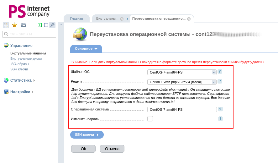 Запуск первоначальной настройки приводит к переустановке системы. Это значит что все данные на виртуальной машине будут удалены. Поэтому если на VPS есть важные данные, то их необходимо предварительно скопировать на локальный компьютер или в другое хранилище.