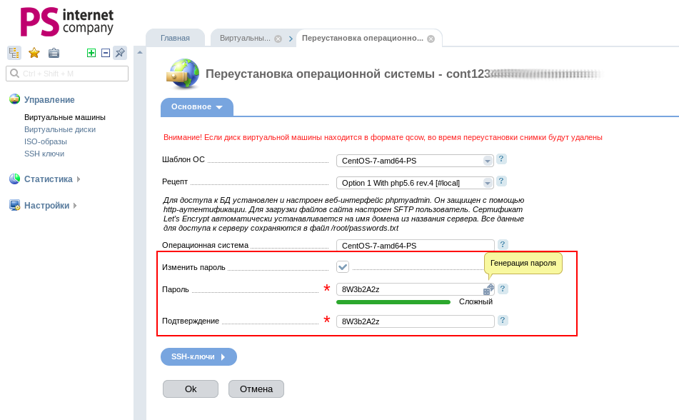 Далее необходимо поставить галочку напротив поля Изменить пароль и ввести root-пароль с подтверждением в поля ниже, либо сгенерировать его путем нажатия на иконку кубиков.