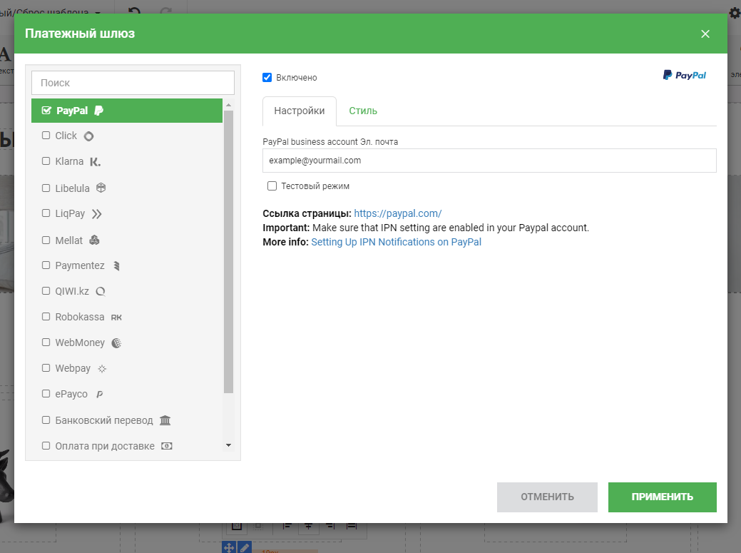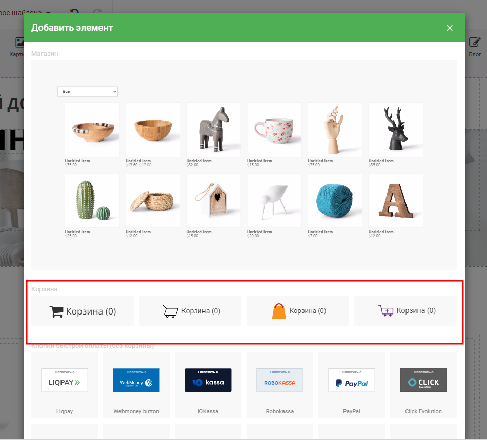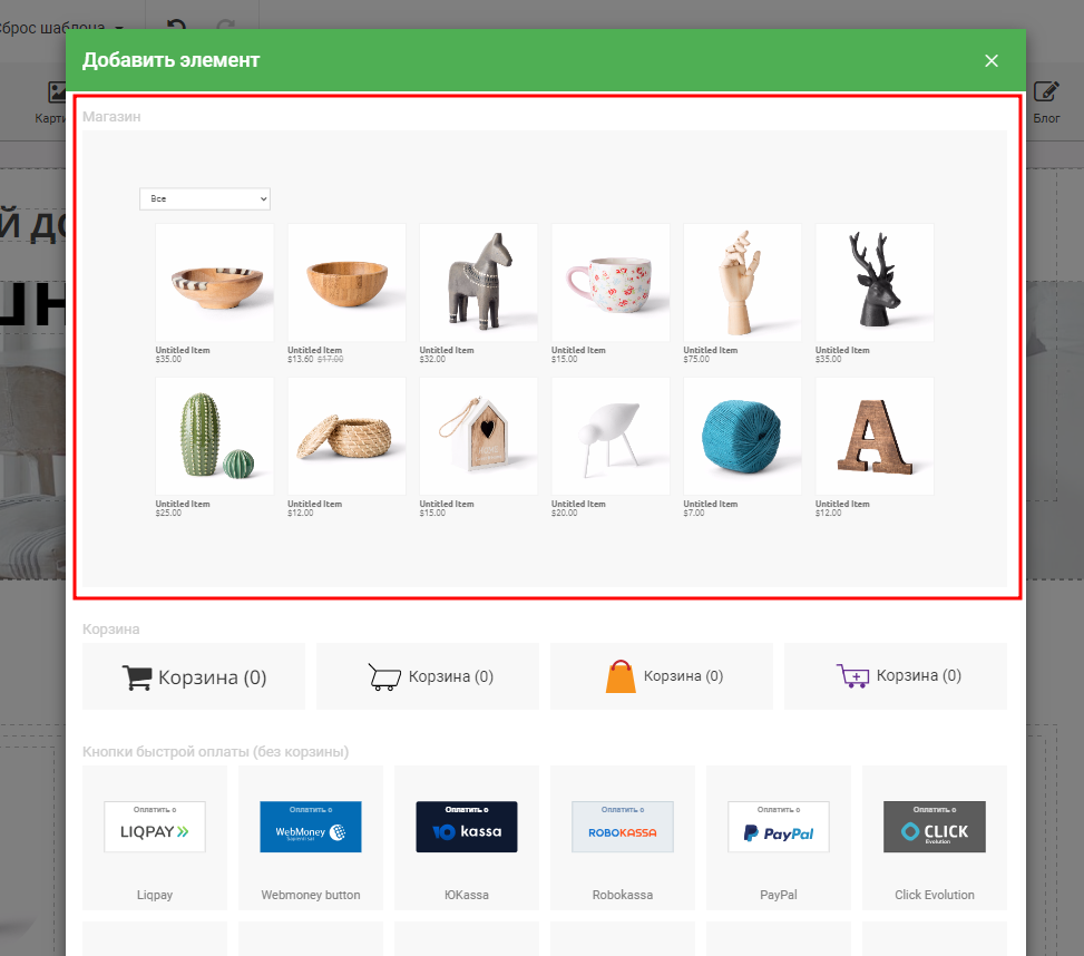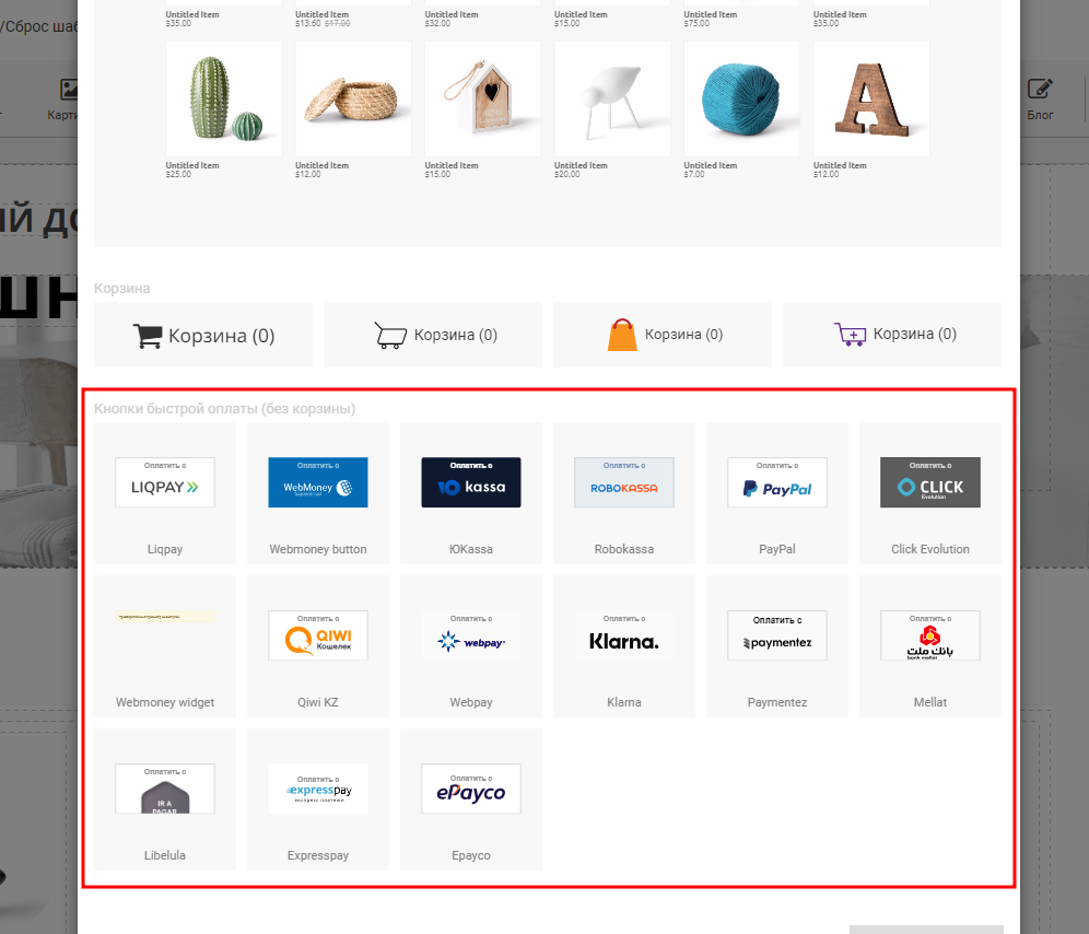 Настройки элемента позволяют подключать платёжные системы доступные для оплаты ваших товаров.