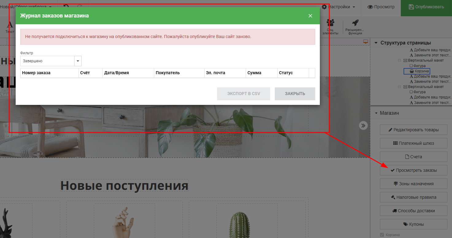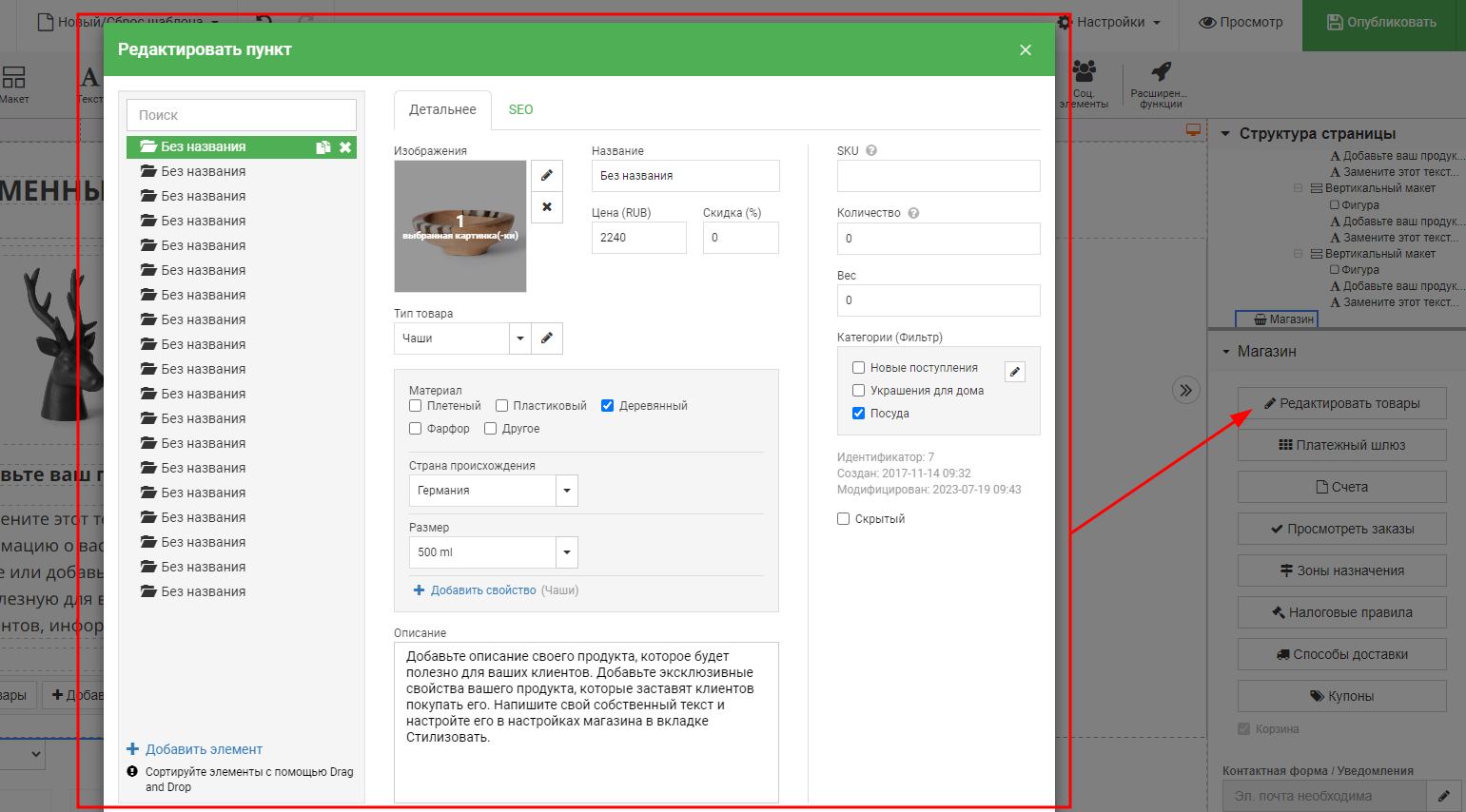 Управление товарами и заказами клиентов осуществляется через настройки элемента.