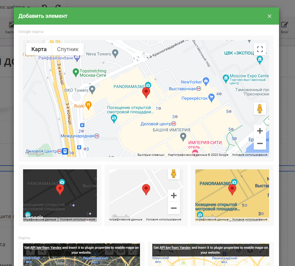Для полноценной работы некоторые поставщики Карт (например, Google) требуют указать API-ключ. Ссылку на инструкцию по получению ключа можно найти в подсказке над полем для его ввода: