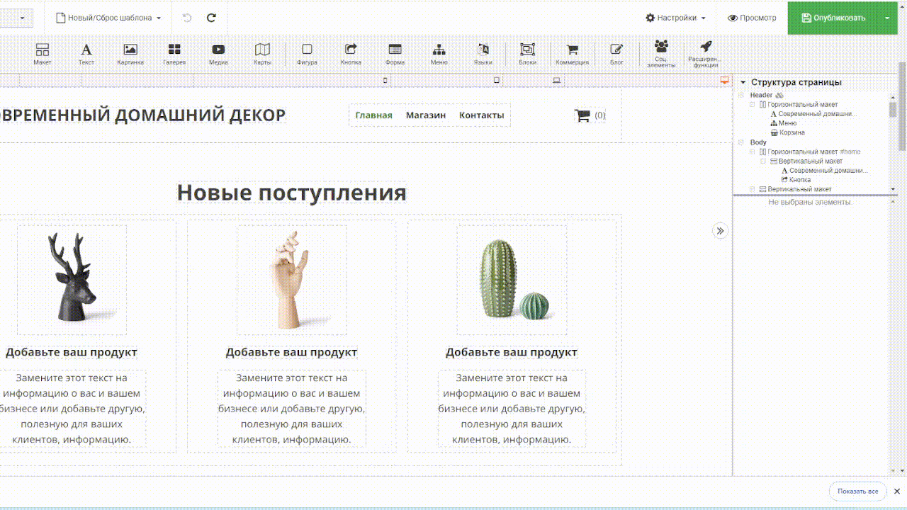 Чтобы добавить магазин на сайт, нажмите на плагин «Коммерция» коммерция и перетащите его в область, где хотите его разместить. Выберите шаблон «Магазин». Выберите «Редактировать товары» на правой панели инструментов. Отредактируйте свои товары и нажмите «Применить».