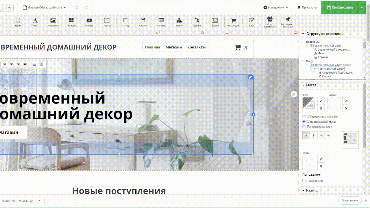 Добавление меню:Перенесите «Меню» с главной панели инструментов→Выберете шаблон «Меню» →Нажмите «Новый элемент меню» →Выберите тип пункта меню (например, «Страница») →Введите «Название» →Нажмите «Применить».
