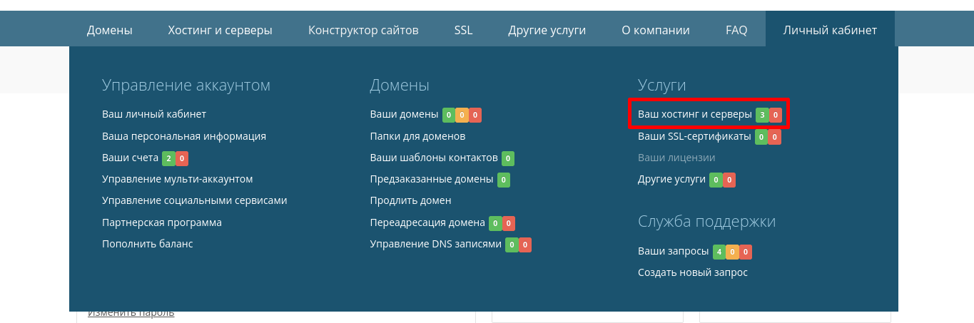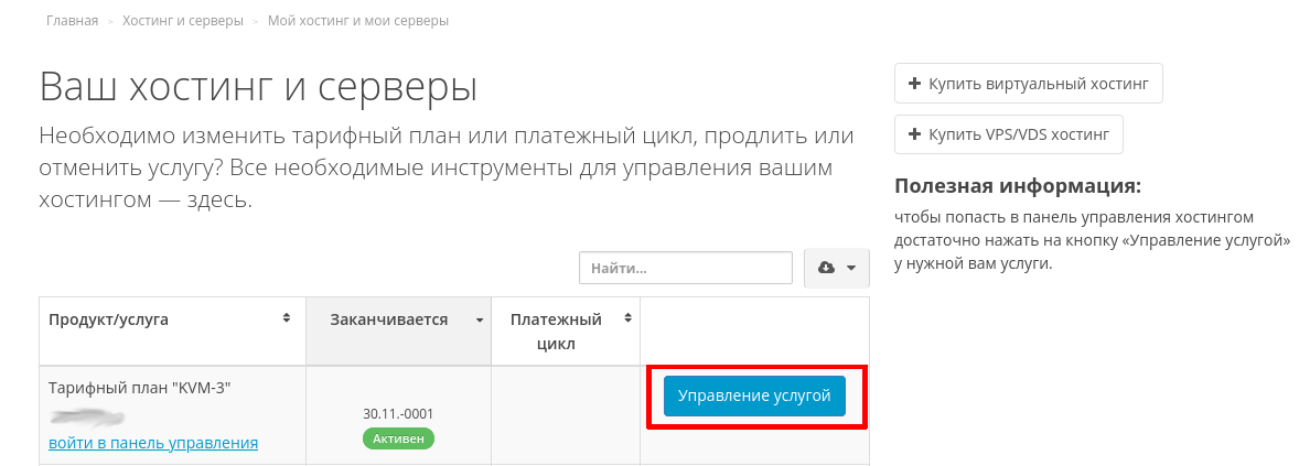 Личный кабинет -> Ваш хостинг и серверы -> Управление услугой.
